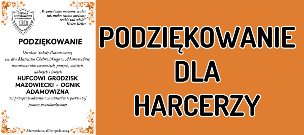 Dyrektor Szkoły Podstawowej im. dra Mateusza Chełmońskiego w Adamowiźnie, uczniowie klas czwartych, piątych, szóstych, siódmych i ósmych serdecznie dziękuję ognikowi Adamowizna za przeprowadzenie warsztatów z pierwszej pomocy